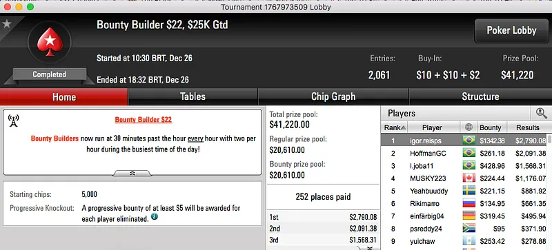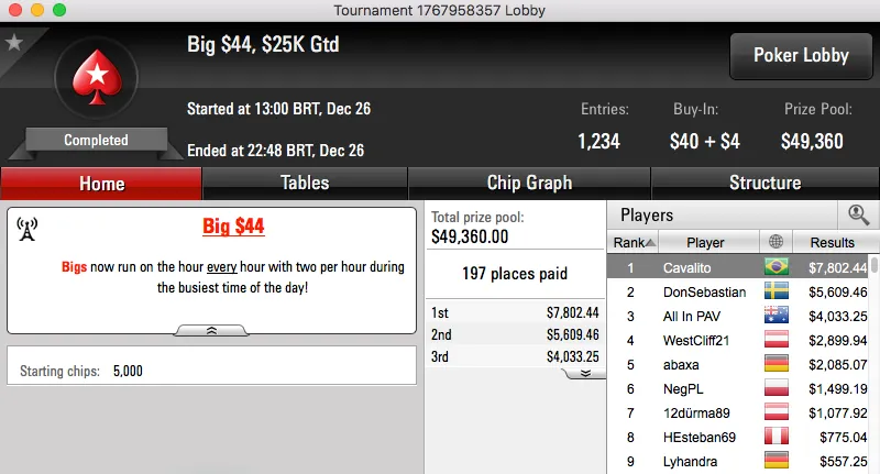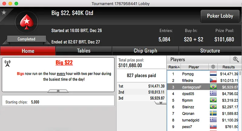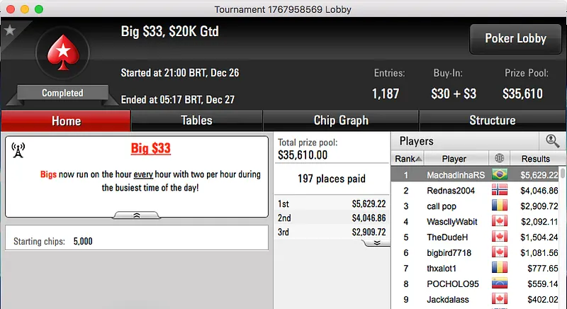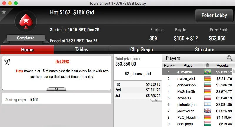 O pódio fecha com dois prémios do Big $109, Bruno "great dant" Volkman foi terceiro ($16,308) e brunin21 cravou ($16,783).