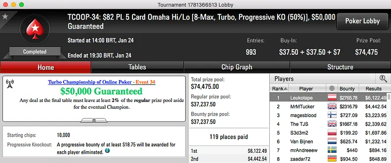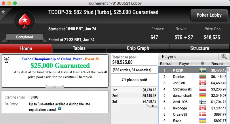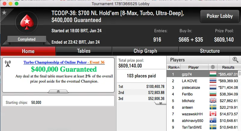 A reta de ontem do Turbo Championship of Online Poker do PokerStars terminou com Luiz Feres chegando a acordo no heads-up do TCOOP-37: $320 NL Hold'em [Turbo, Fat Tuesday SE], $500,000 Garantidos.
