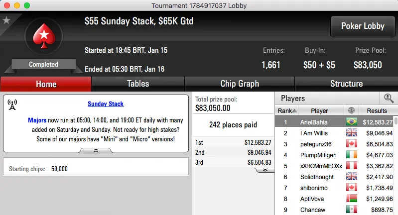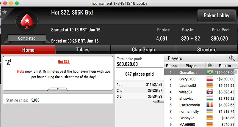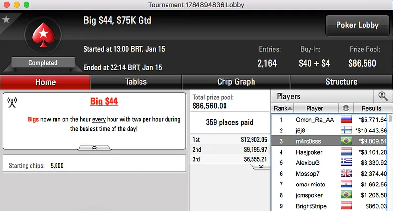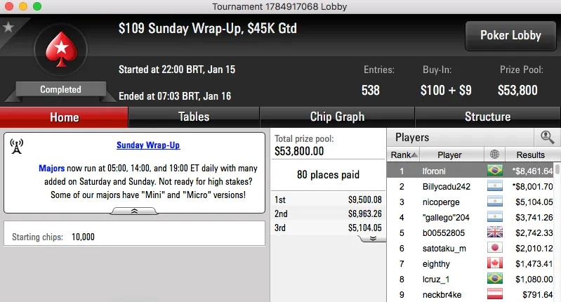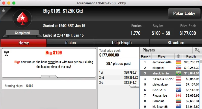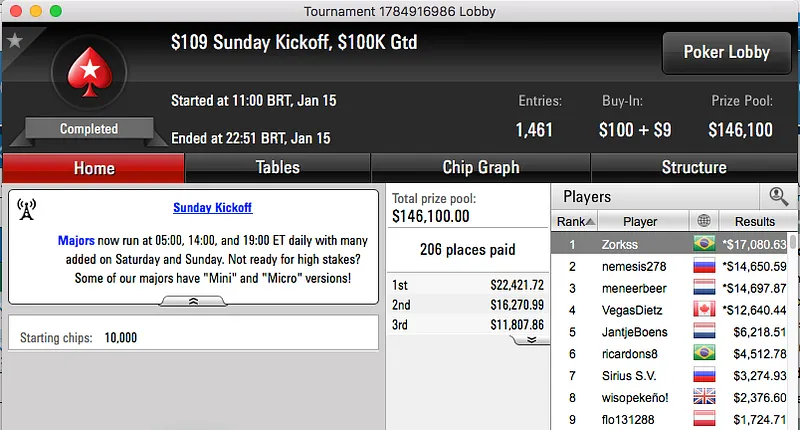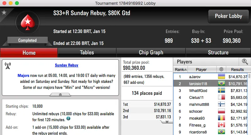 O pódio fecha com o vice de soadmauricio no Sunday Storm, rendeu $22,887.