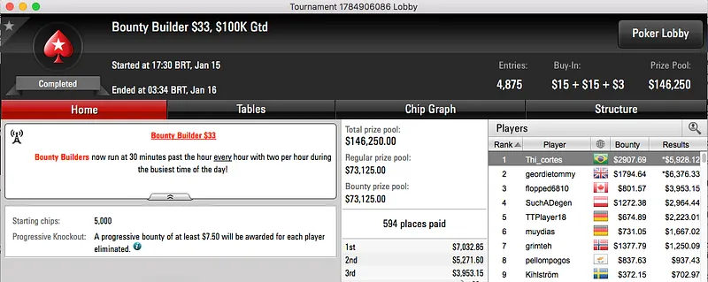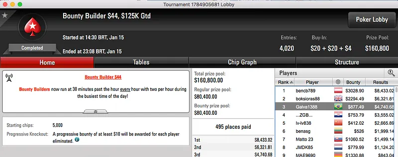 A prata da reta fica para um dos resultados obtidos por Ariel Bahia na reta de ontem, a cravada no Bounty Builder $109. Entre prize pool e bounties o baiano puxou $29,709.