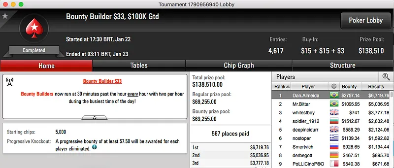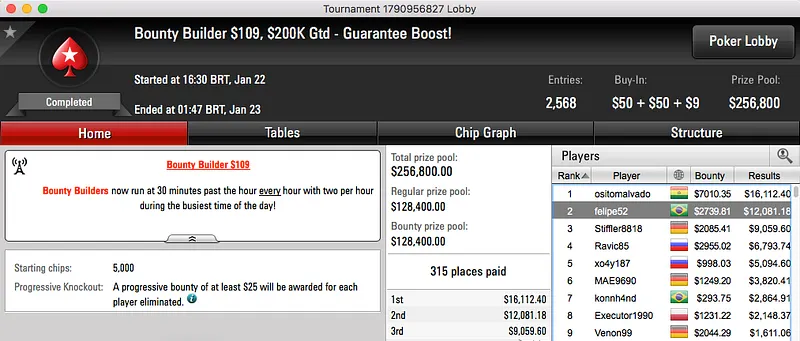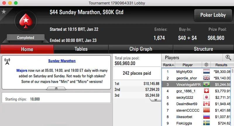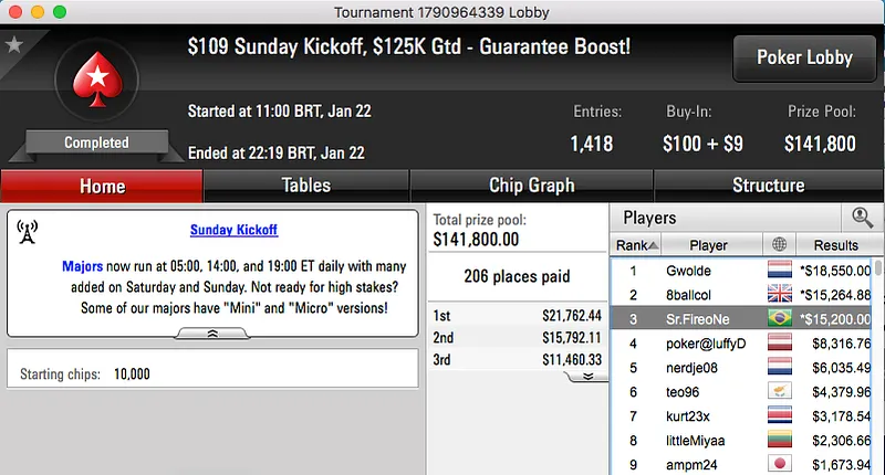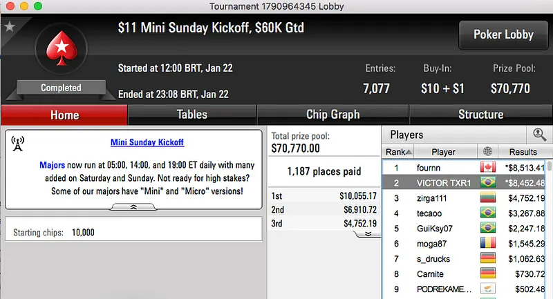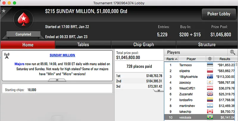 A prata da reta ficou para gtavares10, cravou o Mini Sunday Million e acordou com mais $26,230 na sua conta do PokerStars. O bronze do Mini SM ficou para outro brasileiro fazaoo, ganhou $12,732.
