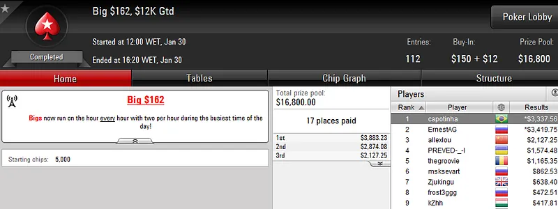 Se vencer a 228 adversários já é dificil, imagina vencer a mais 324? Foi mesmo isso que "thipoker10" fez no Bounty Builder $162. Ele deun nova cravada e arrecadou mais US$11,854 de prêmio.