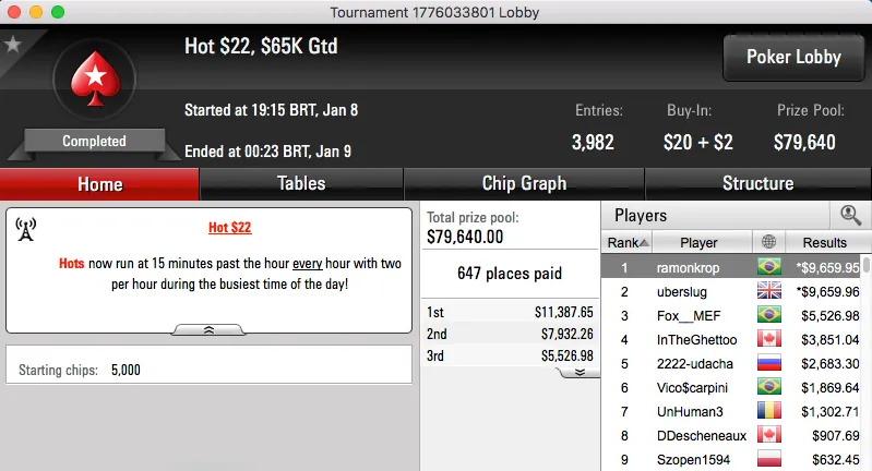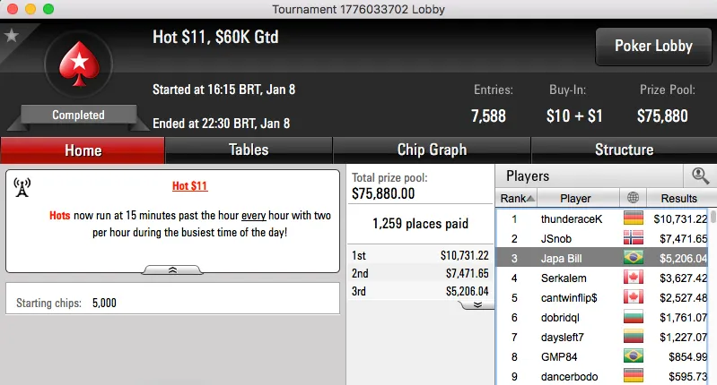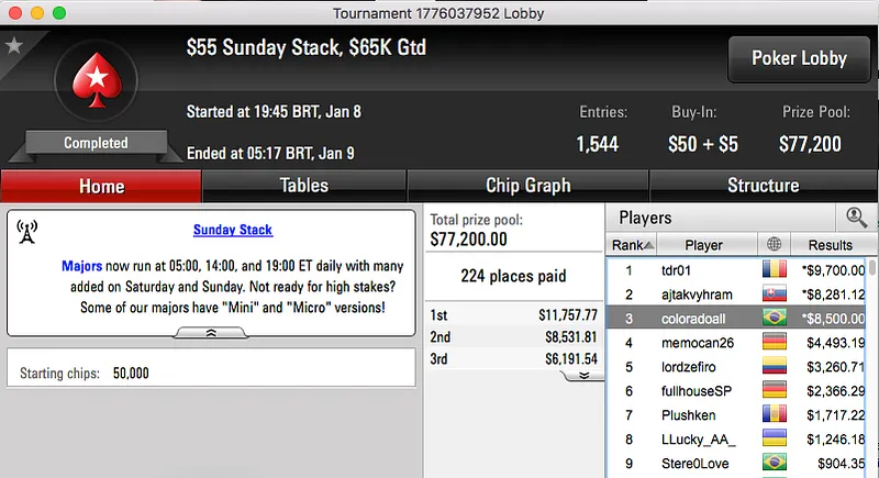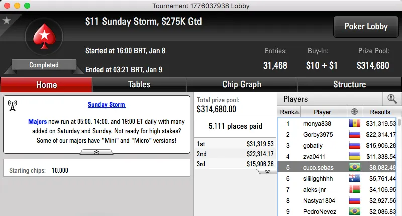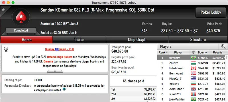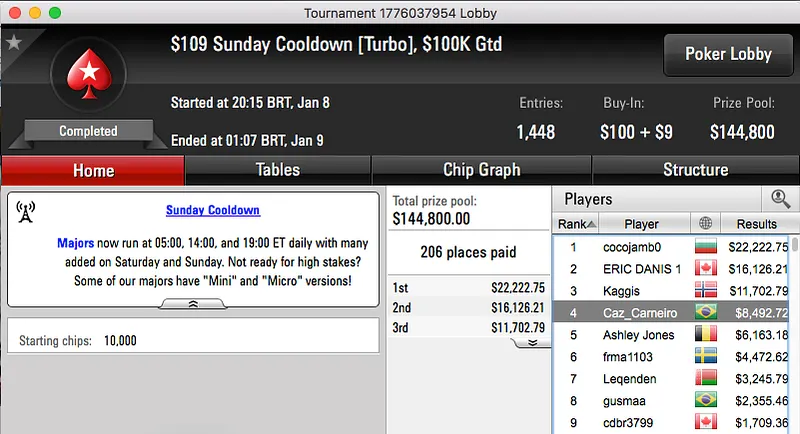 A reta de domingo terminou com muito dinheiro voando para o Brasil. O maior resultado da mesma foi alcançado no $1,050 Sunday Grand, thipoker10 foi vice e puxou $42,224.