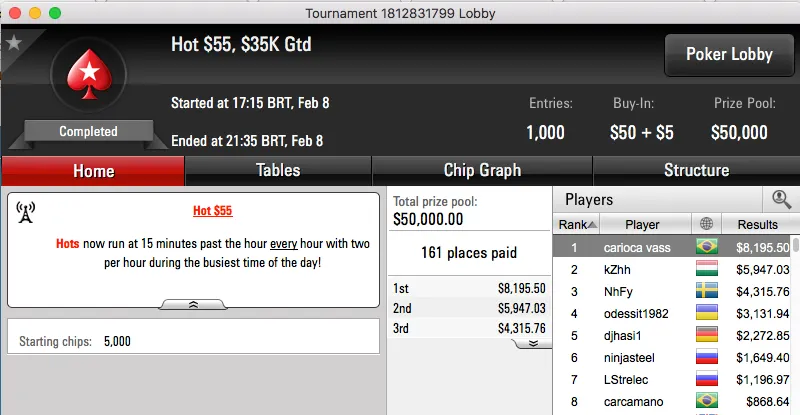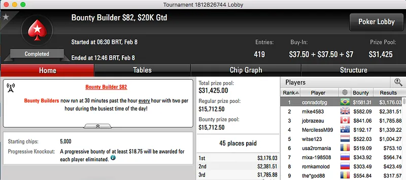 A reta de quarta-feira do PokerStars fica marcada por um heads-up brasileiro no Bounty Builder $109. O torneio terminou com Renan "Aziz.Mancha" Aziz ($15,431) e Bernardo "Machadada RS" Rocha ($11,164) fazendo acordo heads-up.