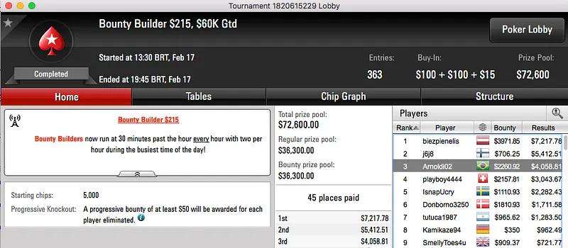 A prata de hoje fica para Arnoldi02, foi bronze no Bounty Builder $215 e ganhou $6,319.