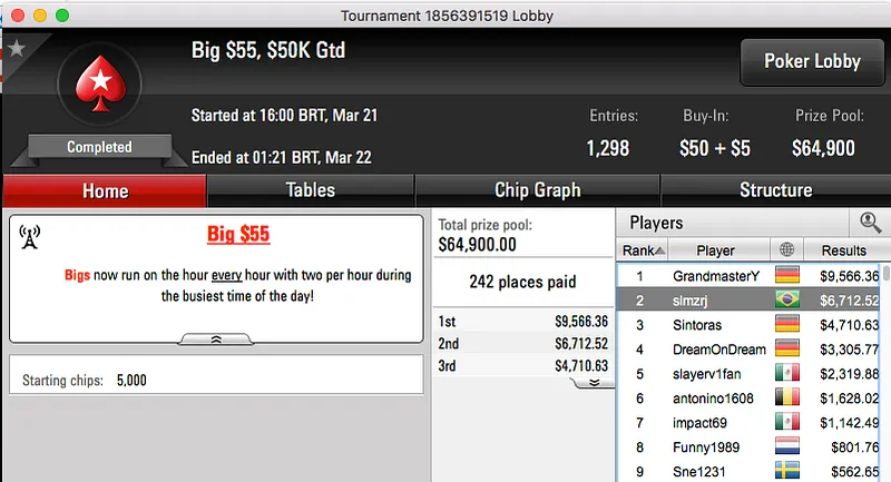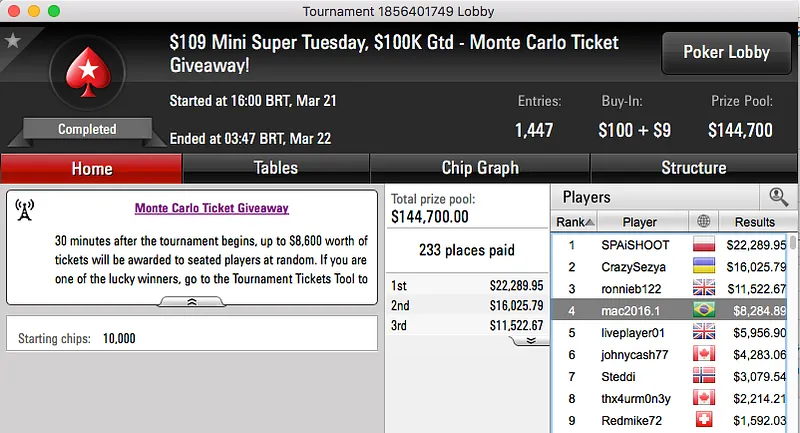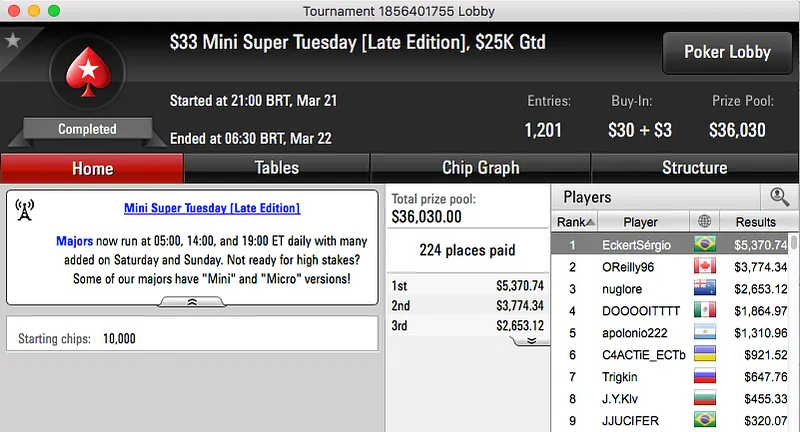 O $320 Super Tuesday de ontem terminou com heads-up entre dois brasileiros e acordo 3-handed, a vitória ficou para reyals_rs ($12,140) e o maior prémio para absolutimão ($13,617).