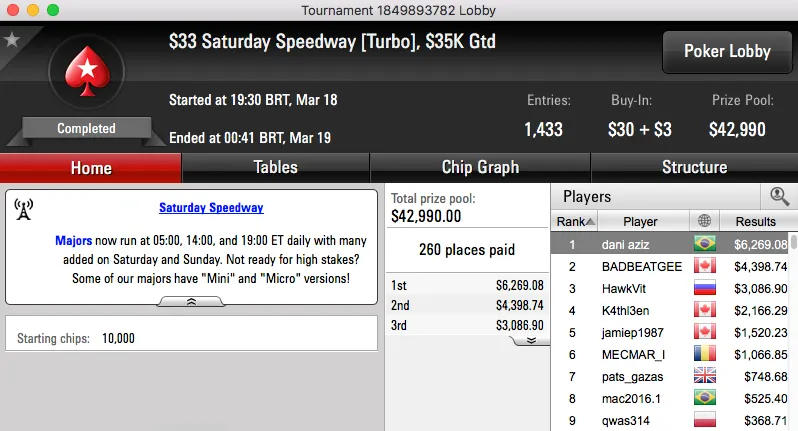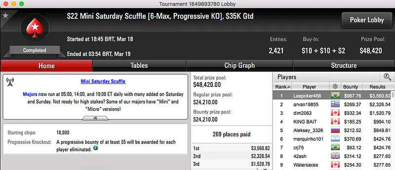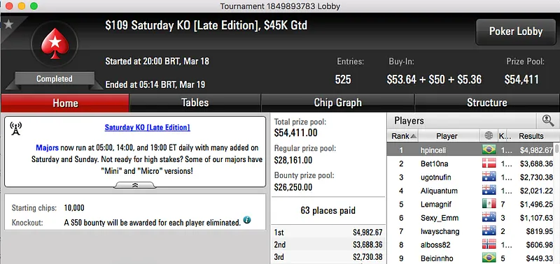 A reta de sábado foi bem melhor que a de sexta-feira e foram vários os resultados interessantes alcançados pelos grinders brasileiros. O maior foi a cravada de gustavo5454 no Bounty Builder $109 do PokerStars. Entre prize pool e bounties o brasileiro ficou com mais $13,368 na sua conta.