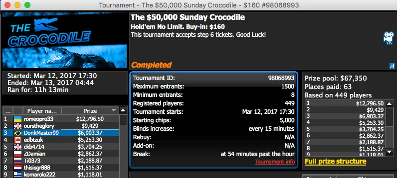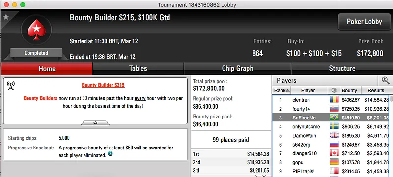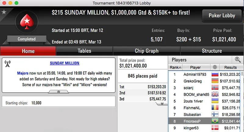 Para fechar o pódio temos ainda o vice de viralatafeio ($22,021) no $22 Mini Sunday Million, este evento teve 4 brasileiros na mesa final e 3 deles estiveram presentes no acordo 4-handed.