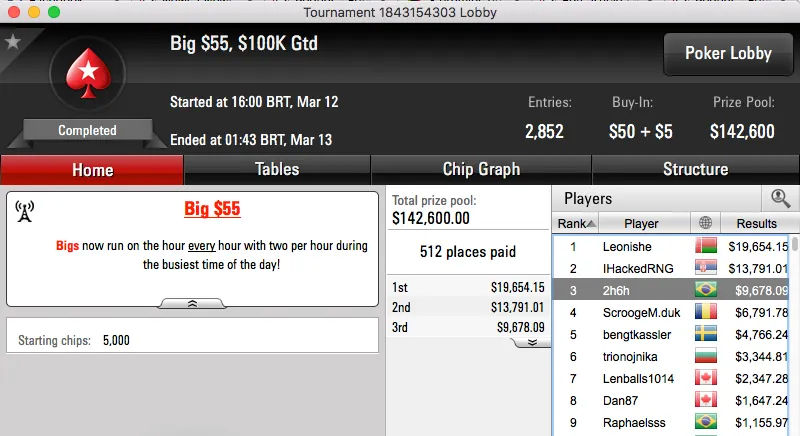 Fora isso temos a relatar a brilhante prestação de Bernardo Dias no $1,050 Sunday Grand do PokerStars, o vice rendeu quase 40 mil dólares ($39,569).