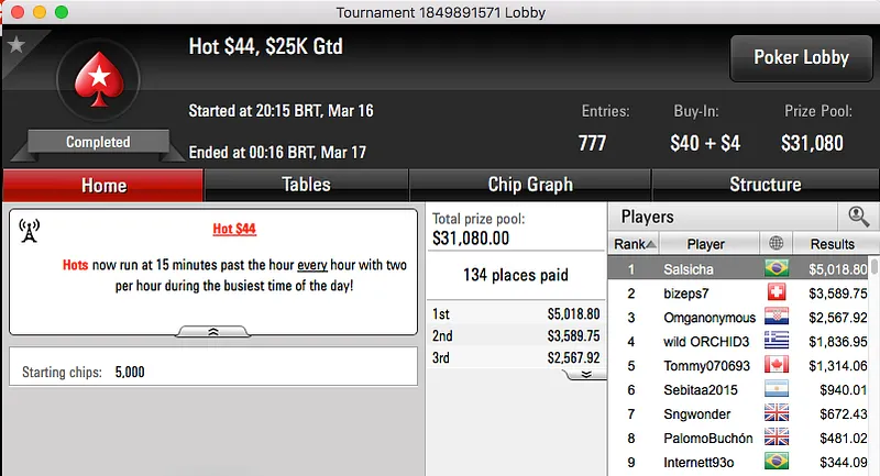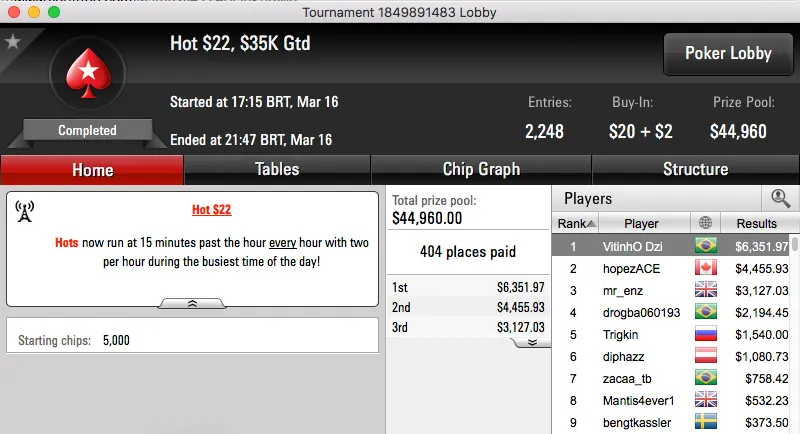 O $320 Thursday Thrill do PokerStars teve 3 brasileiros na sua mesa final e foi de lá que saiu o maior prémio da reta. kartt foi vice e depois de um acordo heads-up conseguiu juntar $10,143 ao seu bankroll. Ainda na FT estiveram mr.salgado30 (8- $2,631) e Ariel Bahia (4- $5,684).