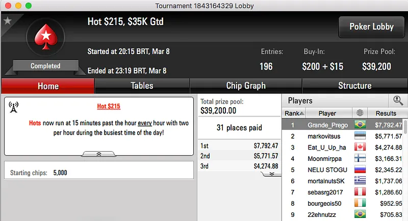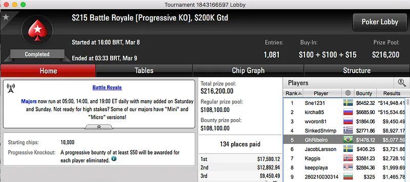 O pódio fecha com a vitória de Tonzera no $22 Mini Battle Royale. A mesma chegou às custas de outro brasileiro, jmlucky26 ($5,950) e rendeu $8,560.