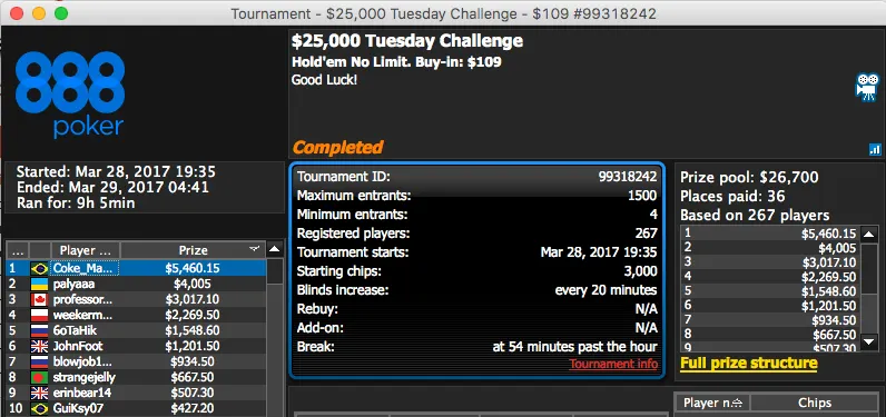O $1,050 Super Tuesday foi devidamente cravado por Renato "bauruzito" Valentim e depois de um acordo heads-up contra o inglês AdvanceFear ambos ficaram com mais $59,505 nas suas contas do PokerStars.
