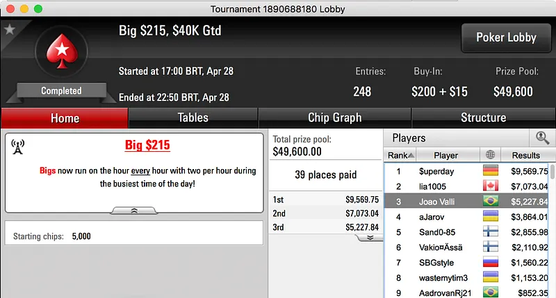 A reta de sexta-feira terminou com bielamado cravando o $215 Fast Friday do PokerStars. Sem lugar a acordo o brasileiro juntou mais $11,961 ao seu bankroll. No mesmo torneio o brasileiro azeitex foi quarto e puxou $4,743.