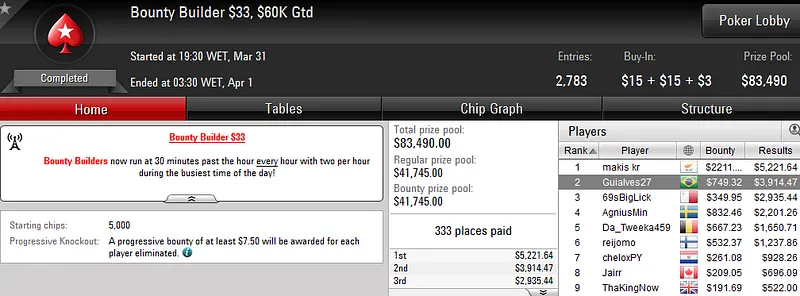 Primeiro, Eli terminou na terceira colocação o Bounty Builder $215 com 334 entradas e US$66,800 de prize pool. Pelo bronze recebeu US$5,386.