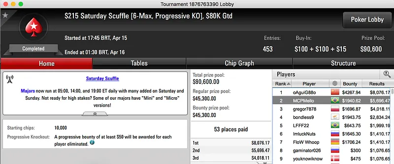 O maior foi o alcançado por MCPMello, o vice no $215 Saturday Scuffle rendeu $7,636. Na mesma mesa final esteve também Fábio "LFFF22" Freitas, foi quinto e recebeu $2,642.
