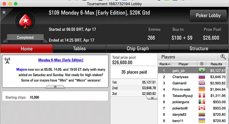 A reta de segunda-feira foi bem interessante para os brasileiros em prova. os feltros virtuais do PokerStars. O melhor resultado foi o bronze de Nathaniel Falber no $215 Monday 6-Max, na sua conta estão agora mais $8,595.