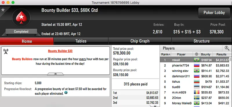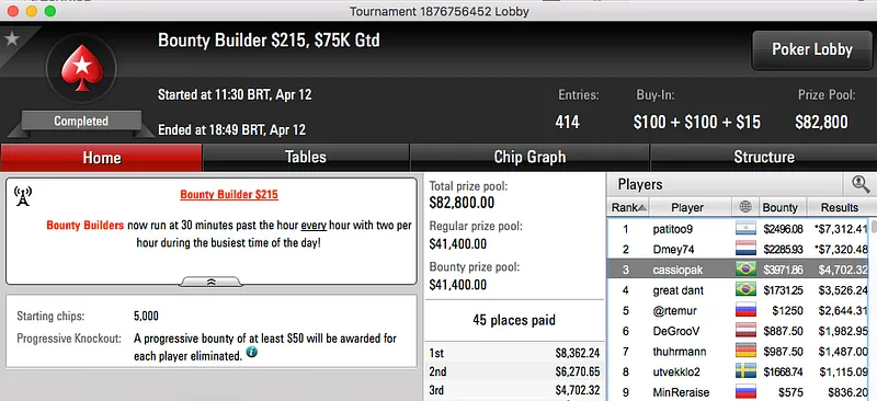 O pódio fecha com o bronze sendo entregue a vqenpp, foi vice no Bounty Builder $109 e ganhou $9,114.