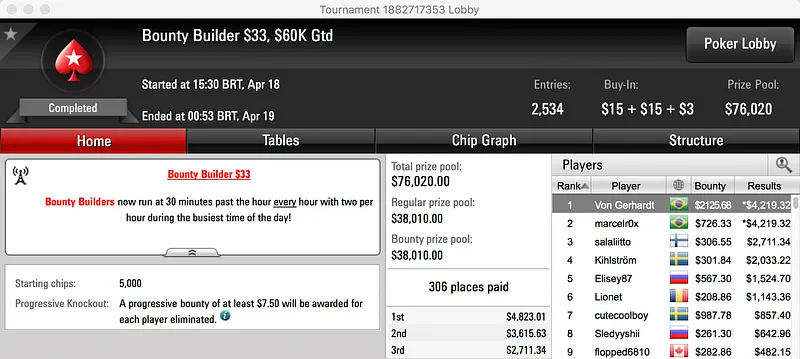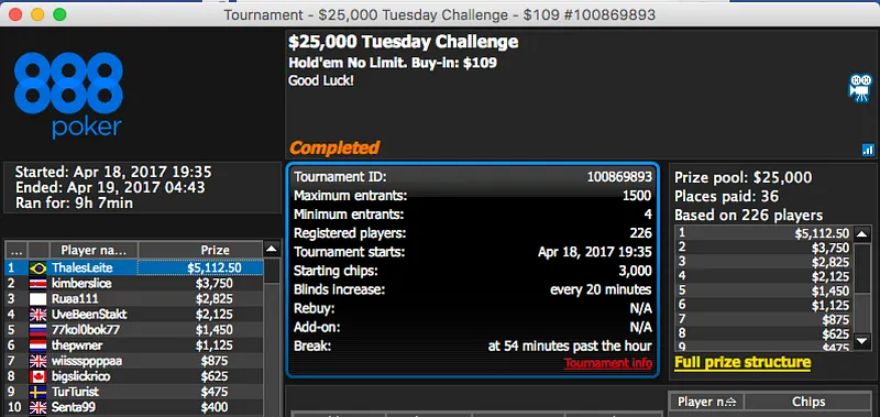 A prata fica para chidoso, fez deal 3-handed no $320 Super Tuesday e recebeu $13,134, o maior prémio. Nesse mesmo acordo esteve presente Eduardo850, foi bronze e puxou $11,729.