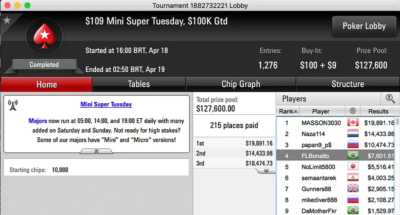 Renato "bauruzito" Valentim foi o maior vencedor da reta de terça-feira vestindo de verde e amarelo. O quarto lugar alcançado no $1,050 Super Tuesday do PokerStars rendeu $26,806.