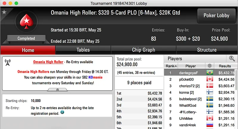 O maior prémio brasileiro da reta de sexta-feira foi ganho por AfranioMM no Bounty Builder $215. A cravada rendeu $18.133