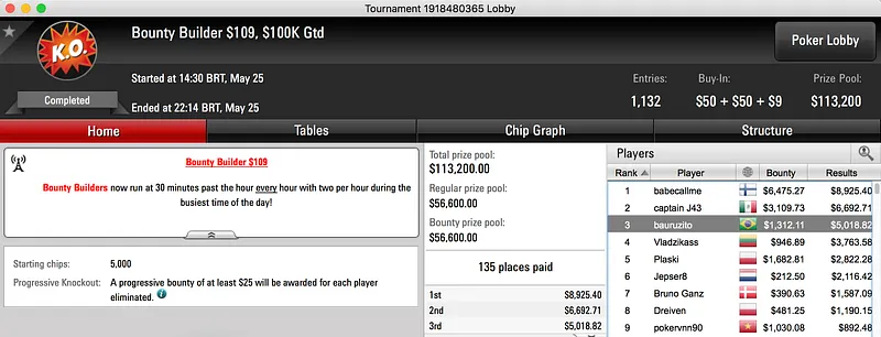 Por último, o bronze fica para FamiliaBiee, cravou o Bounty Builder $22 e ganhou $6.611.