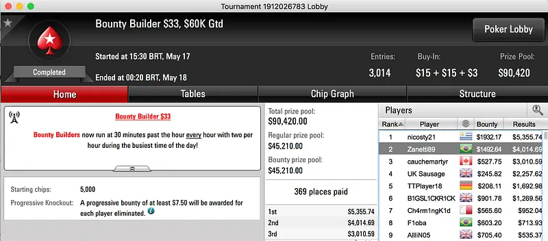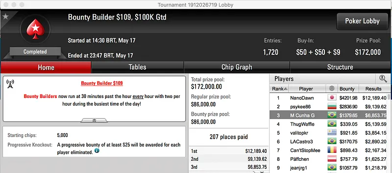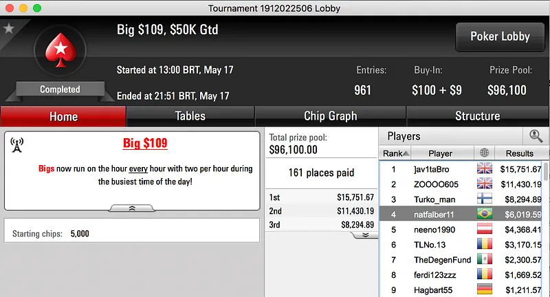 A reta de quarta-feira dos torneios regulares do PokerStars teve como seu maior vencedor brasileiro o ex-Team PokerStars Online, Caio Pessagno. Pessa foi vice no $215 Battle Royale e ganhou $23.057, em 10º ficou Bernardo Dias ($3.075).