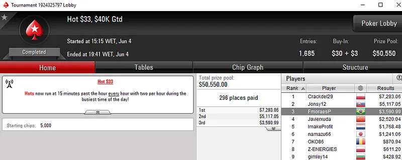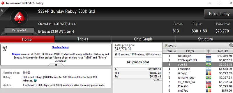 Já no The $20,000 Sunday Monsoon teve 582 registos e Terao90 ficou com a medalha de bronze. O jogador brasuca recebeu US$2,939 de prêmio.
