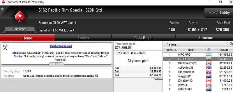 Mesmo assim, dennysramos2 foi vice no Hot $162 com 452 jogadores. Este torneio teve um prize pool de US$67,800 e para o jogador brasileiro foram US$8,946, depois de perder o heads-up com o sueco eijseijs.
