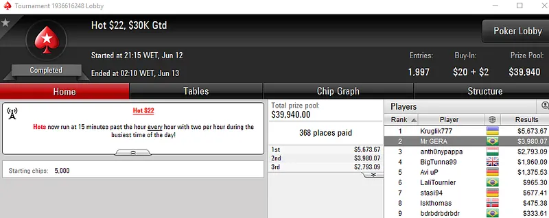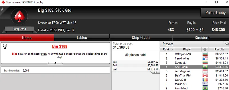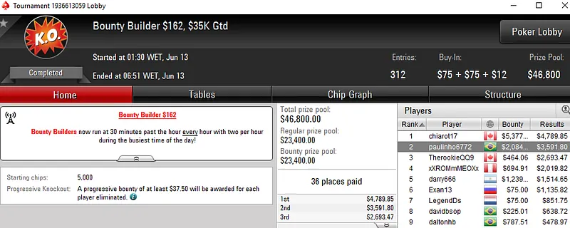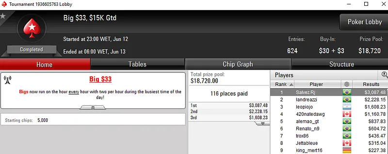 Já Gansao cravou dois torneios regulares do PokerStars para encaixar US$6,094. Primeiro ele venceu o Big $162 onde dividiu o prêmio e recebeu US$3,309.