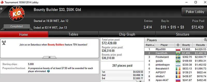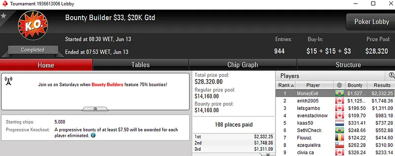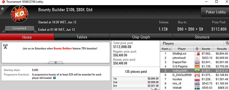 Na reta de ontem o maior vencedor foi fran$mitth que cravou o Bounty Builder $44 para receber US$8,280 de premiação. Este torneio contou com 1,701 jogadores e o prize pool chegou aos US$68,040.
