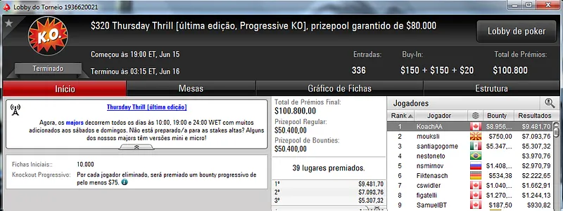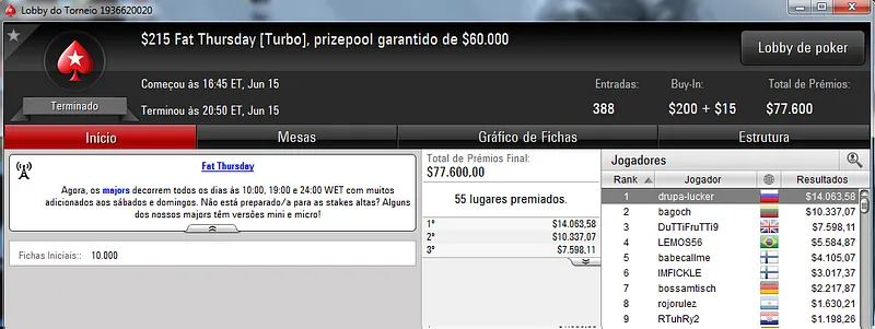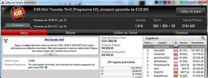 O destaque da reta de ontem foi Léo83 que terminou o $1,050 Thursday Thrill na 5ª colocação. O jogador brasuca foi recompensado com $12,158 pela sua prestação. Este torneio teve a participação de 408 jogadores que fizeram o prize pool chegar aos $408,000.