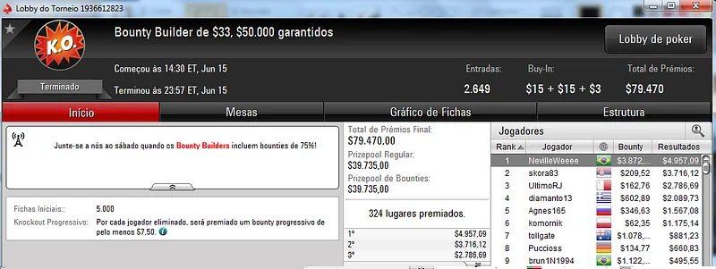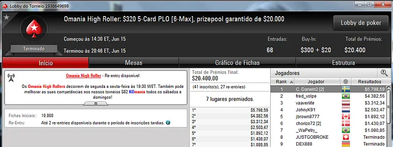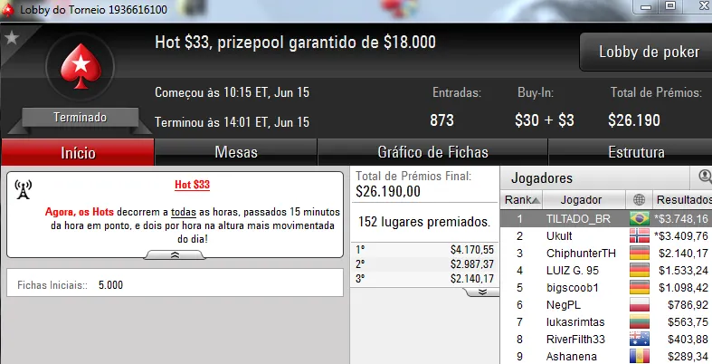 Já JoaoPauloG06 cravou o Big $109 com 554 jogadores e levou para casa $9,802. O torneio contou com 554 entradas e o prize pool chegou aos $55,400.