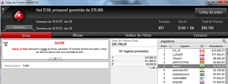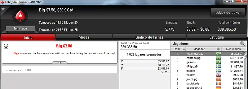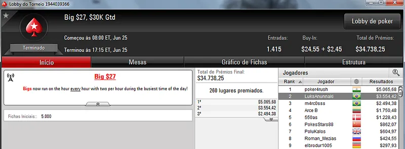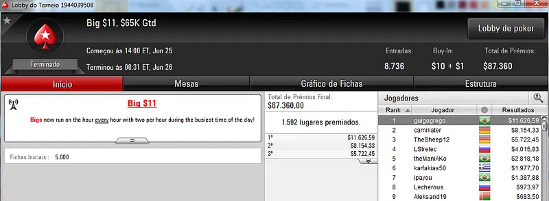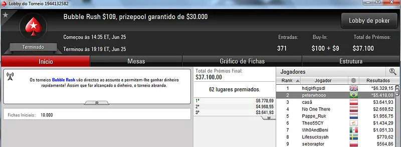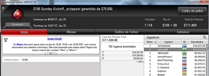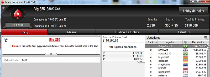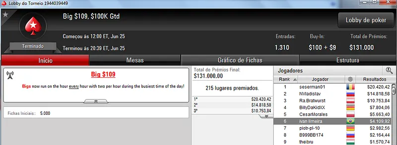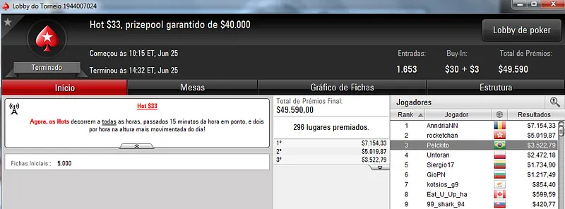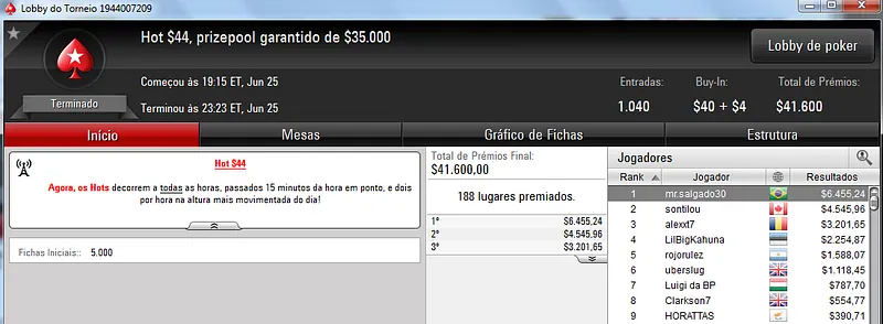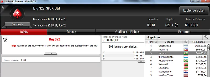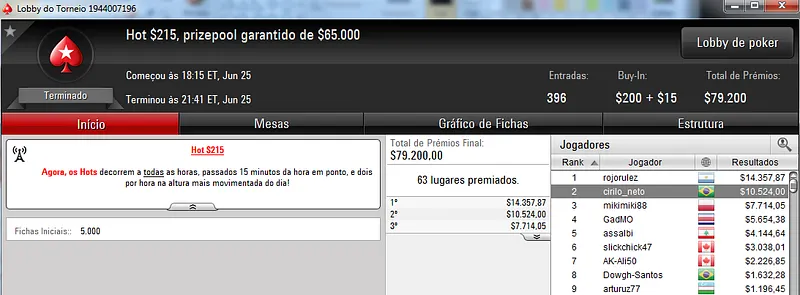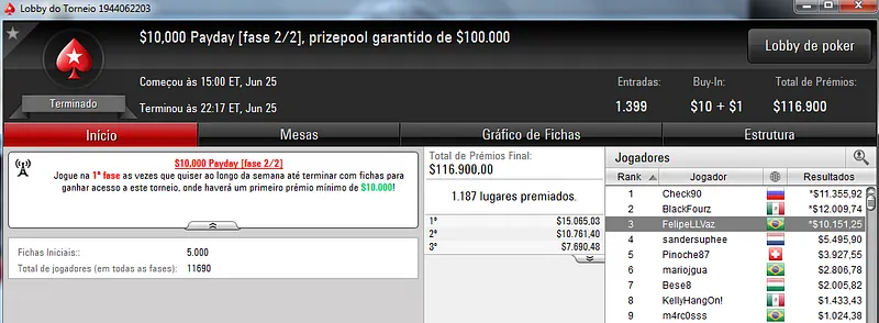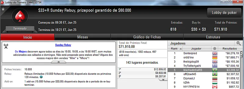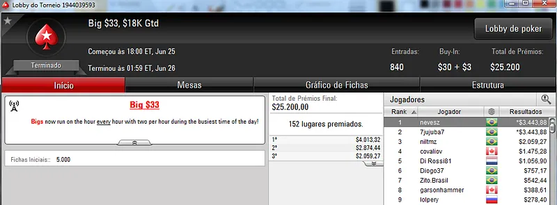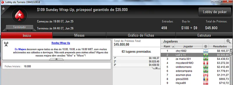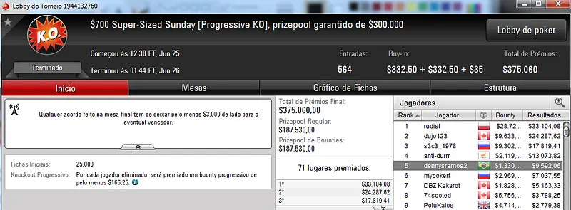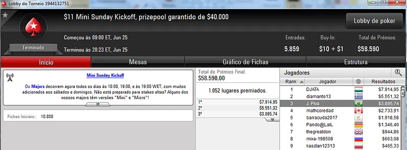 Quem também se deu bem foi Pseudo Fruto no $22 Mini Sunday Million com 9,018 jogadores e $182,160 de prize pool. O jogador brasuca recebeu $19,000 depois de fazer acordo no heads-up com o indiano riverking021.