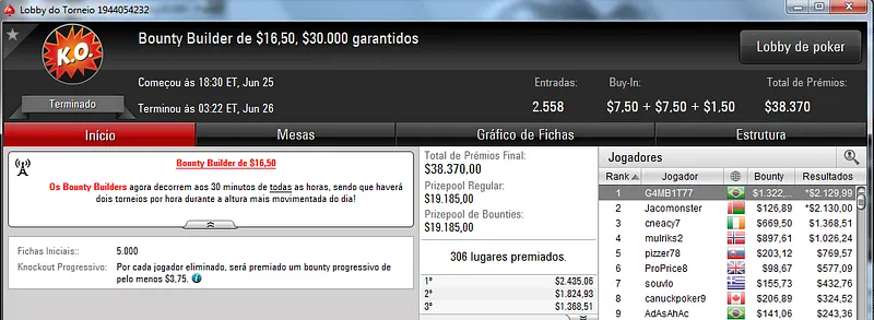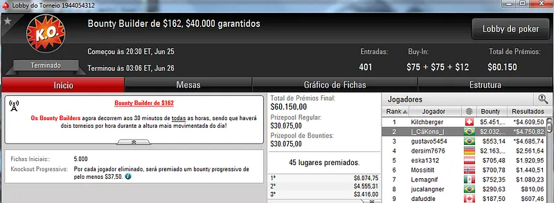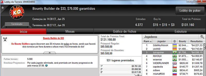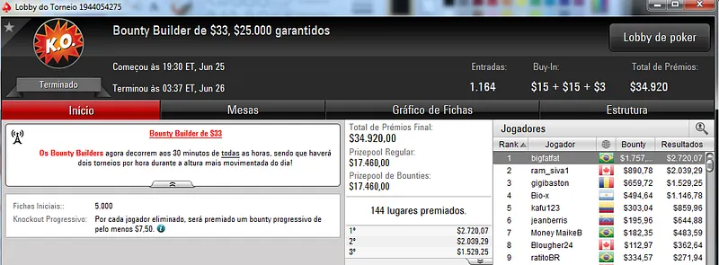 O maior foi no Bounty Builder $215 com 851 jogadores. Lincon "Lincownz" Freitas cravou o torneio e encaixou $14,365 de premiação mais $10,629 em bounties ($24,995 no total).