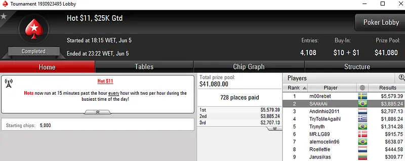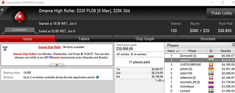 Pedro "peterwhooo" Correa cravou o Bounty Builder $109 para se tornar o maior vencedor da reta. Este torneio teve 1,292 registos e o jogador brasuca trouxe o maior prêmio do prize pool acumulado de US$129,200. Pedro recebeu US$16,496 depois de vencer MarckusEx no heads-up.