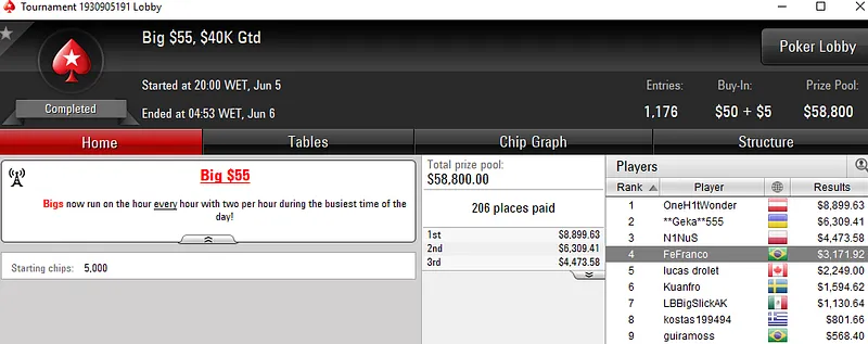 O Bounty Builder $55 contou com 1,327 participantes e viu Yuri "tecaoo" Martins levar para o caixa o maior prêmio, US$9,914. O prize pool chegou aos US$66,350 e foi distribuído pelos 162 melhores jogadores.