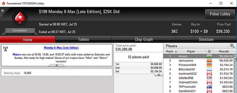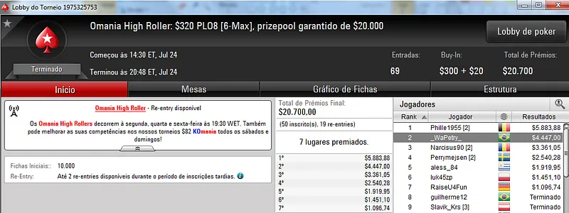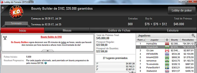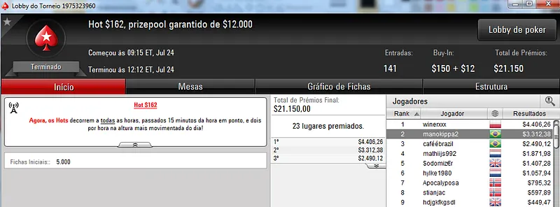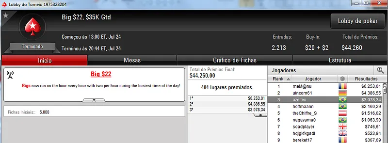 Já no PokerStars, o destaque vai para Ariel Celestino que cravou o Big $215 com 228 jogadores para receber $8,797.