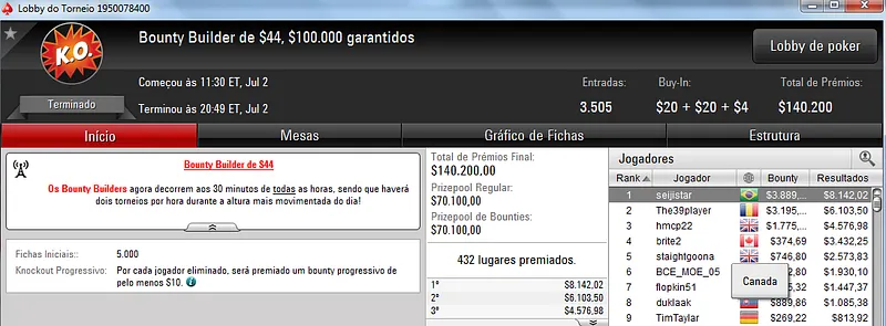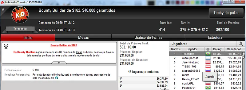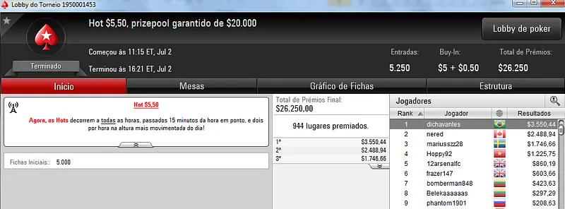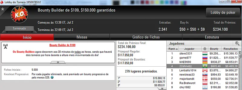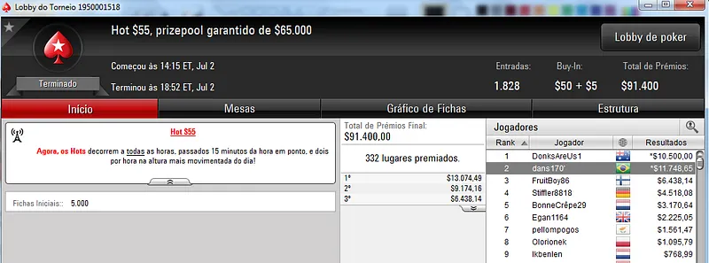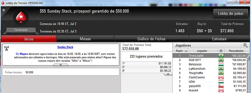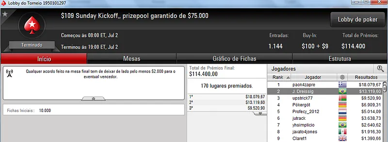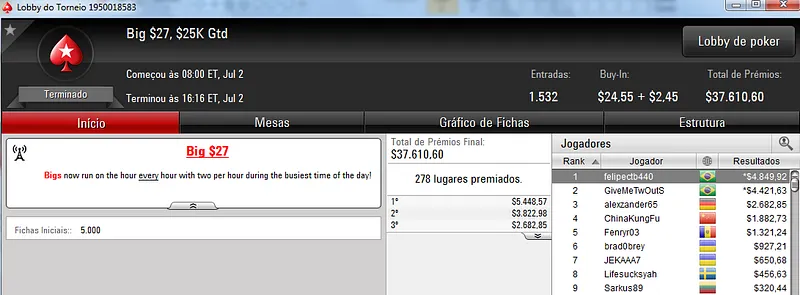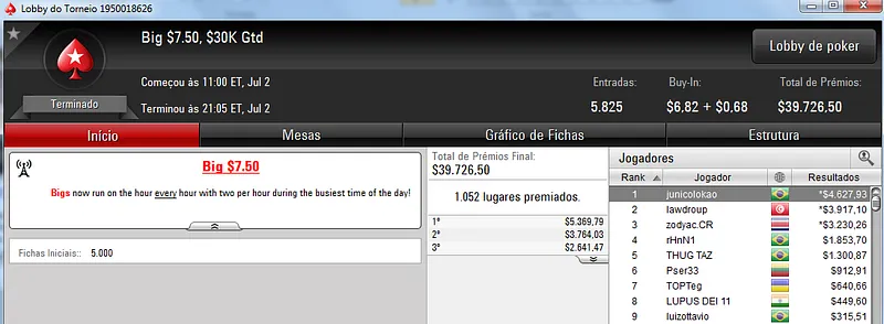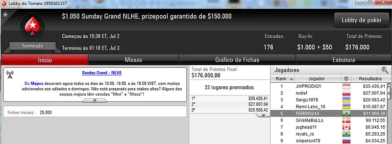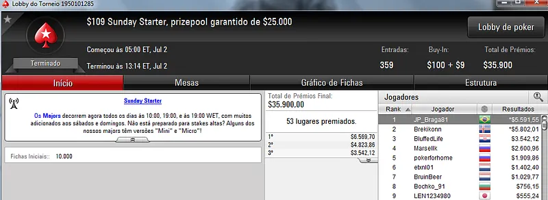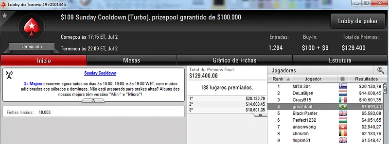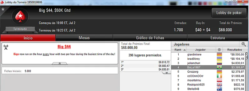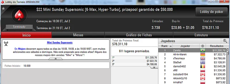 Quem também se deu bem foi dennysramos2 que cravou o $22 Mini Sunday Million para receber $20,426 de premiação depois de fazer acordo no 4-handed. Este torneio teve 9,322 entradas e o prize pool chegou aos $186,440. Na terceira colocação, tiagogp1 forrou $15,561 de prêmio.