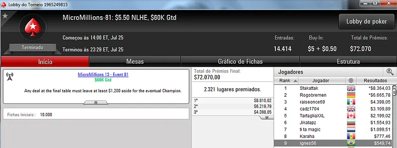 Na reta de ontem o Brasil conquistou mais 3 títulos no MicroMillions do PokerStars! Os jogadores brasileiros não têm dado tréguas nesta série de torneios e continuam arracando boas forras por buy-ins reduzidos.