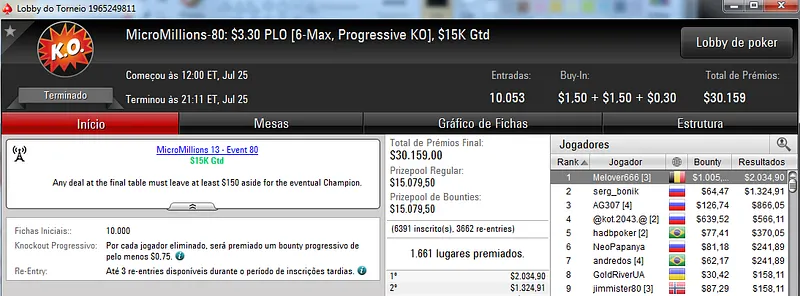 Já no MicroMillions #79: $1,10 NLHE estiveram em prova 18,287 jogadores que fizeram o prize pool chegar aos $18,287. A maior fatia foi para edu_frc que cravou $1,922 e o título. Na terceira colocação, DanielOsw faturou $984.