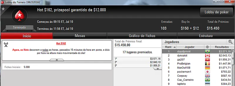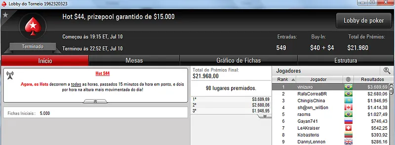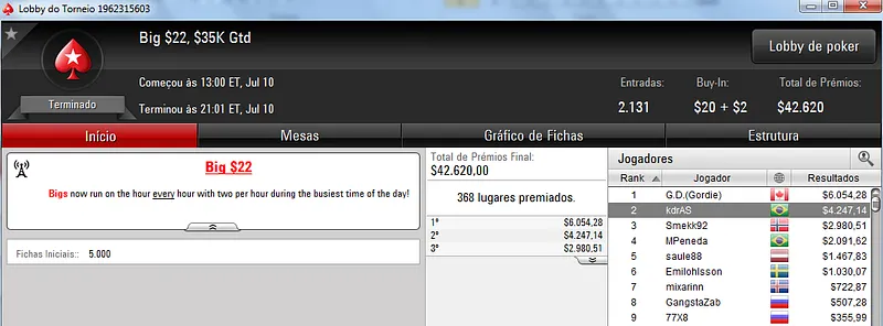 O grande vencedor da reta foi ratitoBR que cravou o Bounty Builder $44 para receber $8,734 entre prémio e bounties. O torneio contou com 1,631 jogadores e o prize pool ascendeu aos $65,240.