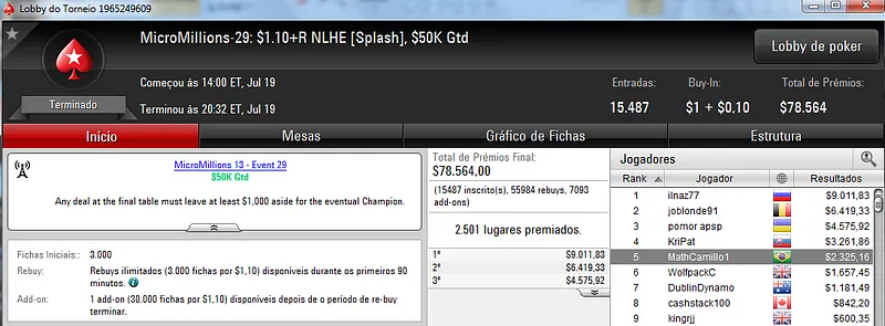 Ontem foi a vez de FUTESURF sair com a medalha de ouro num desses eventos. O MicroMillions #28: $5,50 NLHE [Heads-Up] teve a participação de 6,146 jogadores. No top da classificação FUTESURF levou o melhor prêmio, cerca de $2,701, depois de ter vencido planty07/08 no heads-up final.