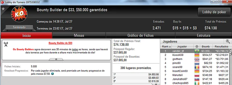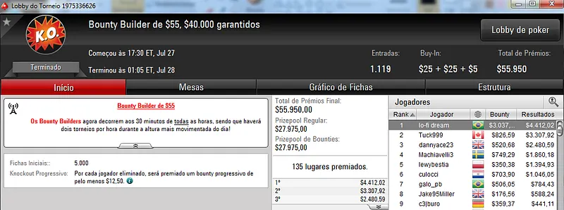 Já o Big $55 contou com 1,079 jogadores e a cravada pertenceu a Thi_cortes que levou para casa $8,372 pelo primeiro lugar. O prize pool do torneio foi de $53,950 que foi distribuído pelos 118 melhores jogadores.