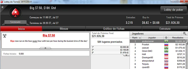 Luiz Antônio "Giant_Santos" Constantino chegou ao pódio do $1,050 Thursday Thrill em forrou $35,344 entre prêmio e bounties pelo terceiro lugar. O torneio teve a participação de 429 jogadores e o prize pool chegou aos $429,000. Na sétima colocação NemesisMsop faturou $7,804.
