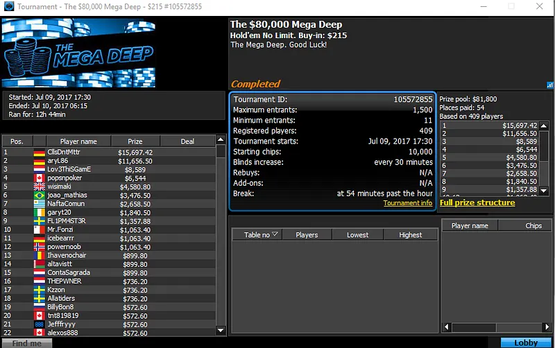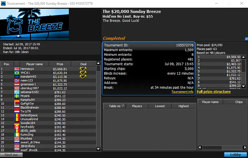 PudimSedutor também teve um bom desempenho e terminou o $60,000 Sunday Challenge com 475 jogadores na segunda colocação. Esta classificação rendeu $8,400 ao jogador brasuca.