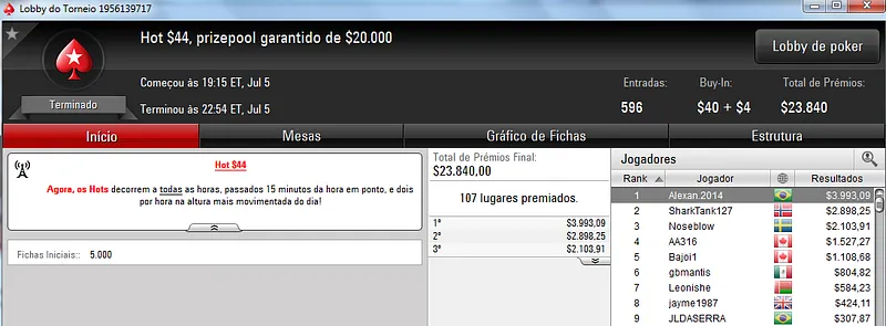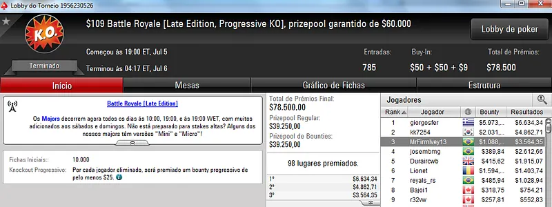 João "joao Valli" Valli deu show ontem no $215 Battle Rayale com 1,098 jogadores. O jogador brasileiro cravou o torneio e faturou $17,866 de prêmio mais $14,167 em bounties. O torneio contou com um prize pool de $219,600 e a faixa da premiação chegou aos 134 melhores classificados. Ainda na mesa final deste torneio mc_palermo encaixou $5,437 pelo sexto lugar.