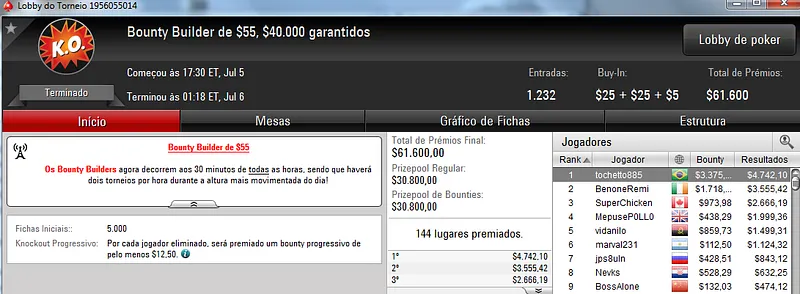 Já no Bounty Builder $215 com 345 jogadores, Bruno "great dant" Volkmann recebeu $15,140 pela conquista do torneio que teve a participação de 344 jogadores, em que o prize pool chegou aos $69,000.