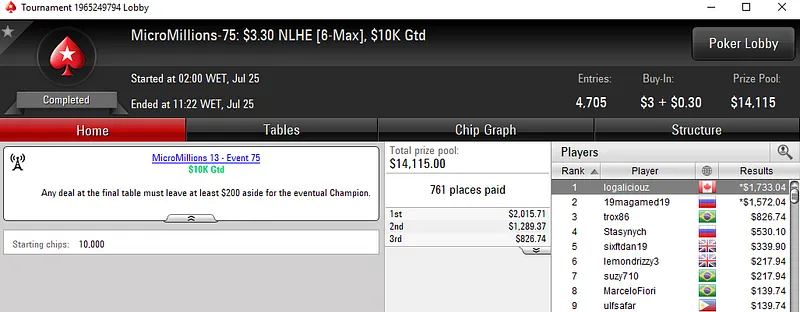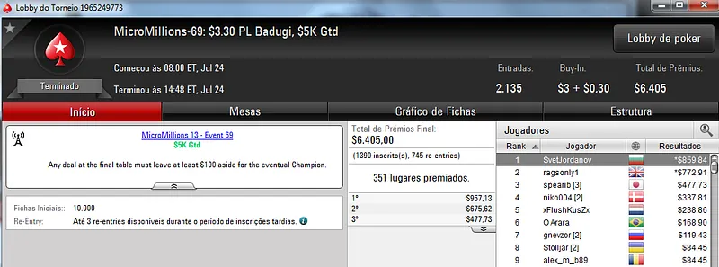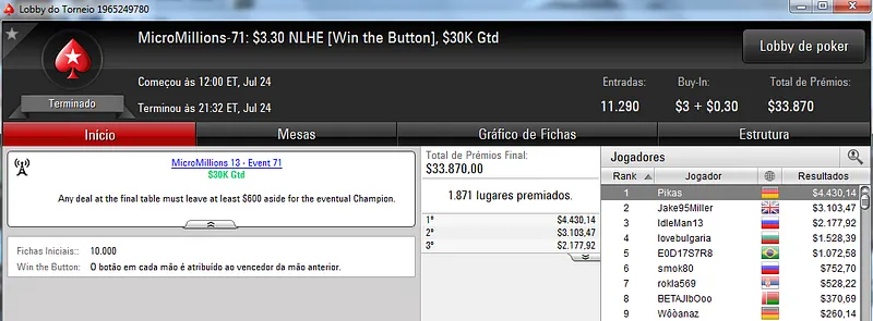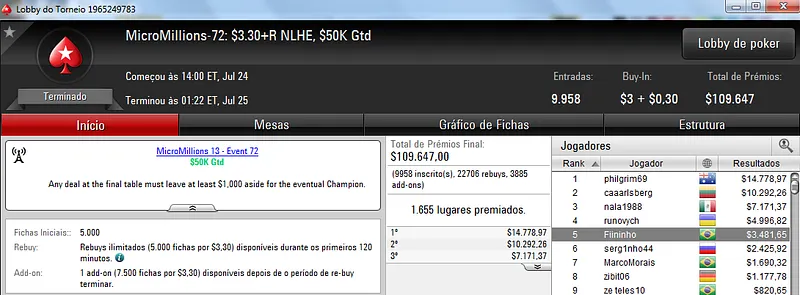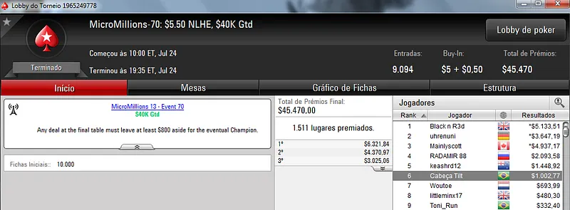 Já é recorrente o Brasil trazer um título em cada dia desta série de torneios. Ontem não foi diferente e Jujubh tratou de vencer o MicroMillions #74: $5,50 NLHE [Bubble Rush] com 6,049 participantes. Este torneio teve um prize pool acumulado de $30,245 que foi dividido pelos 1,007 melhores classificados. Para o jogador brasuca ficaram reservados $4,304 depois de sair com a medalha de ouro. Destaque ainda para danmaria que recebeu $1,397 pelo quarto lugar na classificação.