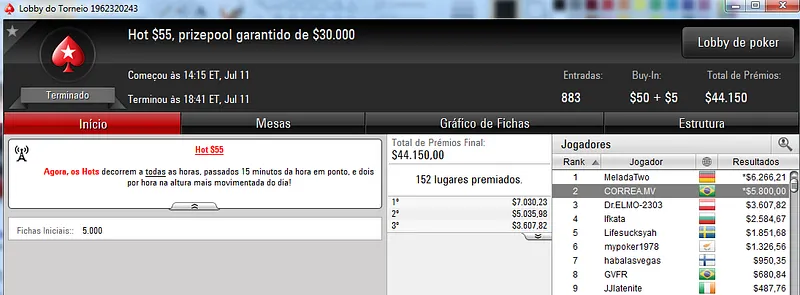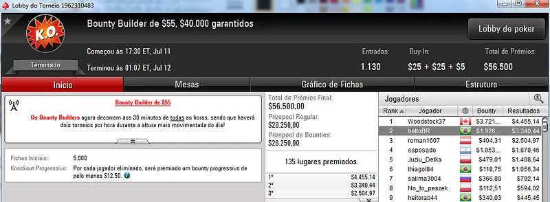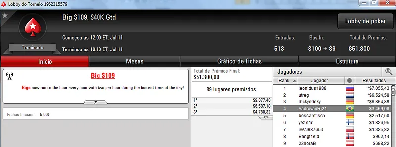Já no The Big $55 com 1,116 entradas e $55,800 de prize pool, Rômulo "chaavees" Araújo cravou o torneio e levou para casa $8,445 de prêmio.