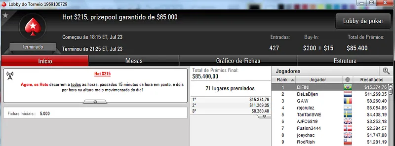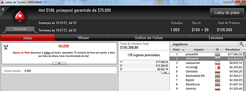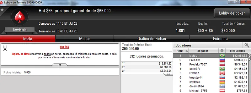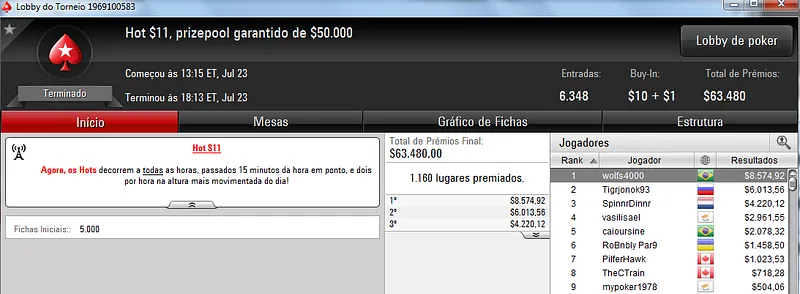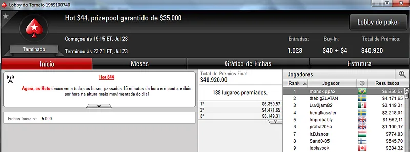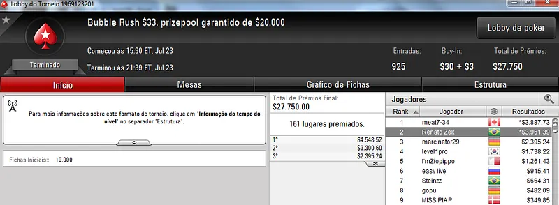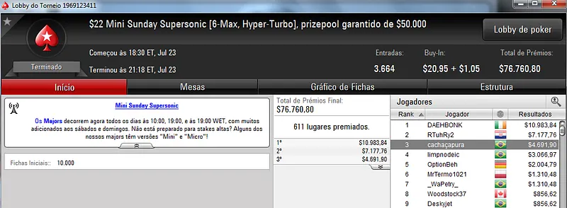 Já no $22 Mini Sunday Million só deu Brasil! Com 9,209 registros este torneio contou com um prize pool de $184,180. Três jogadores brasucas ficaram nos três primeiros lugares do pódio. Bernardo87 levou o maior prêmio e cravou $24,319. Na segunda colocação, Ipmassia forrou $17,059. A medalha de bronze rendeu $11,971 a wantuirpoker.